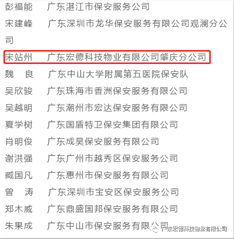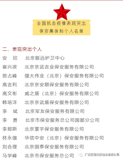 为表扬先进、鼓舞士气,鼓励广大保安企业和保安员争先创优,积极投身常态化疫情防控和维护社会治安各项工作,公安部近日通报表扬保安行业抗击疫情表现突出的105个集体和500名个人。?广东宏德科技物业肇庆分公司的宋站州同志在此次的表彰中获得“表现突出个人”荣誉,为公司争光。